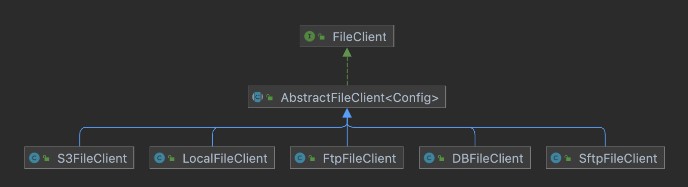 FileClient 有 5 个实现类,使用不同存储器进行文件的上传与下载。UML 类图如所示: