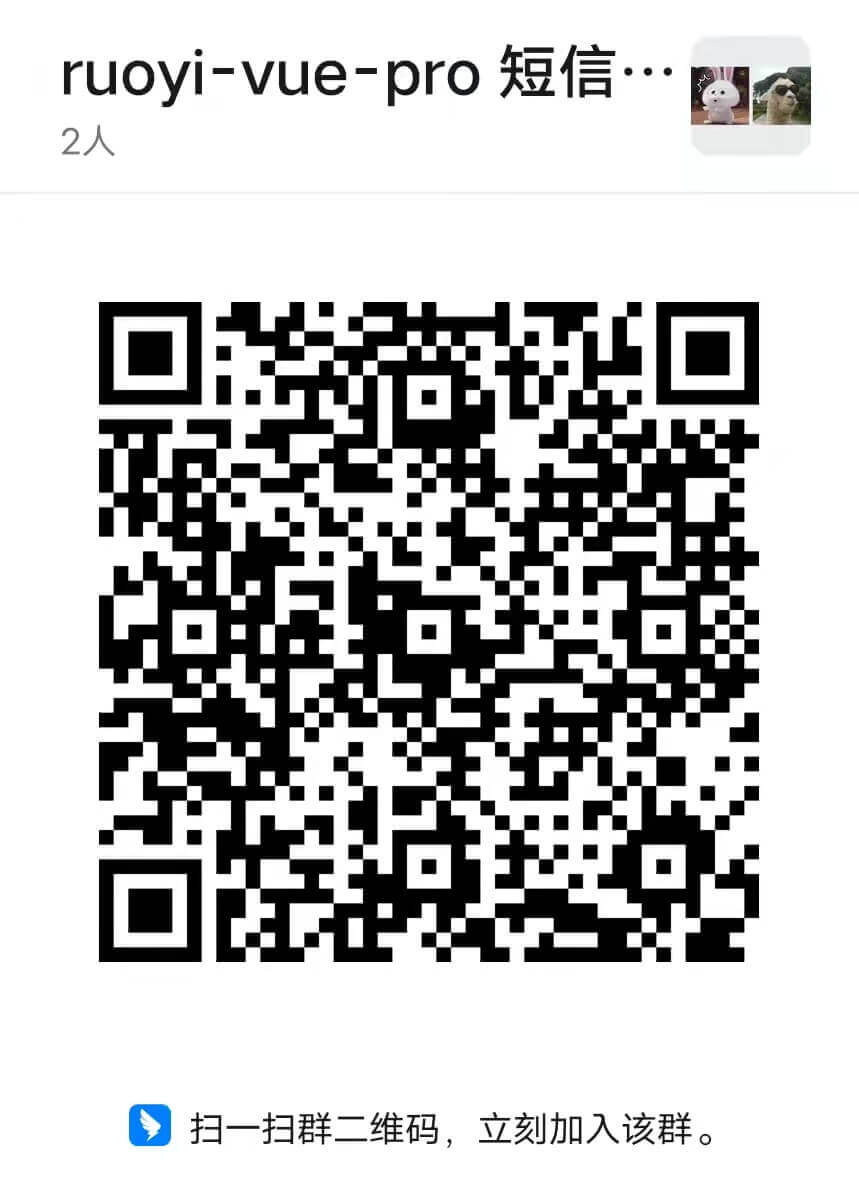 ① 使用钉钉,扫码 图片 加入机器人所在的【ruoyi-vue-pro 短信测试群】,查看测试短信的模拟发送。